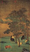 赵雍,元代书画家。字仲穆,湖州海宁县(今属浙江)人。赵孟頫次子。以父荫入仕,官至集贤待制、同知湖州路总管府事。书画继承家学,赵孟頫尝为幻住庵写金刚经未半,雍足成之,其联续处人莫能辨。擅山水,尤精人物鞍马,亦作界画。书善正、行、草,亦长篆书。精鉴赏。传世作品有《兰竹图》、《溪山渔隐》等